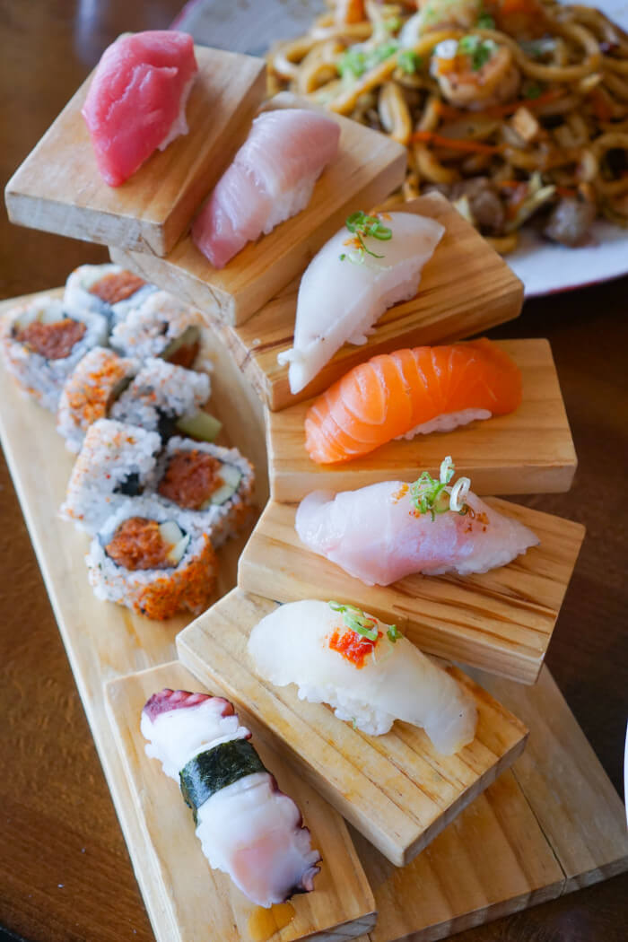 Chef’s choice of assorted 5 pieces nigiri with 3 pieces of salmon and 3 pieces of tuna sashimi with a tuna roll.