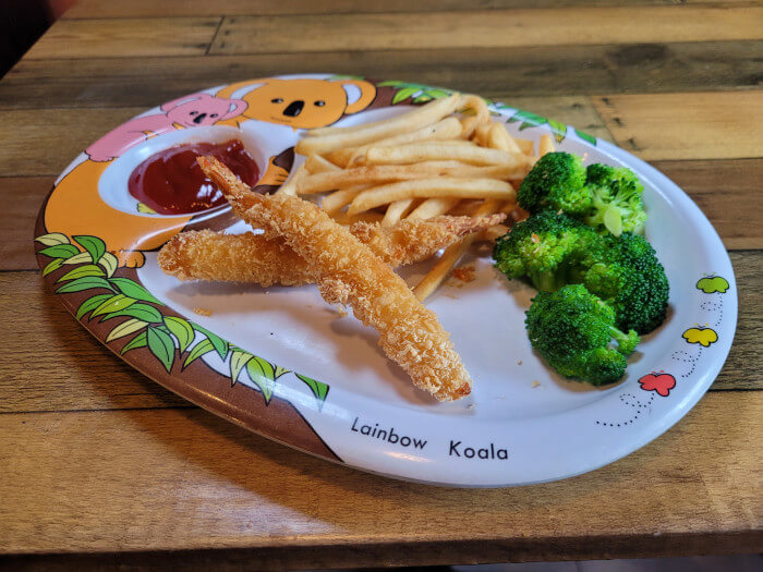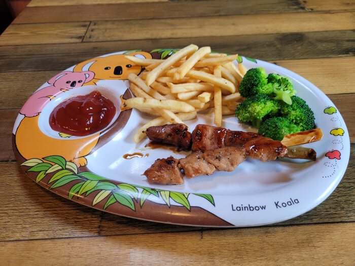 Potatoes, carrots, tempura veggies and steamed rice with choice of chicken or pork.
