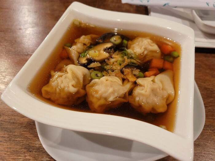 umami dashi broth served with wonton pork dumplings, shiitake mushrooms, peas, carrots, green onions and fried shallots