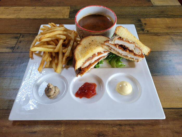 katsu fried cutlet of chicken or pork with swiss and provolone cheese melted between hawaiian sweet bread toasted with garlic butter and served with truffle fries and house Japanese curry sauce for dipping (add bacon $2)