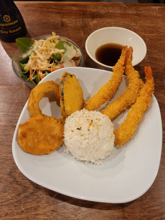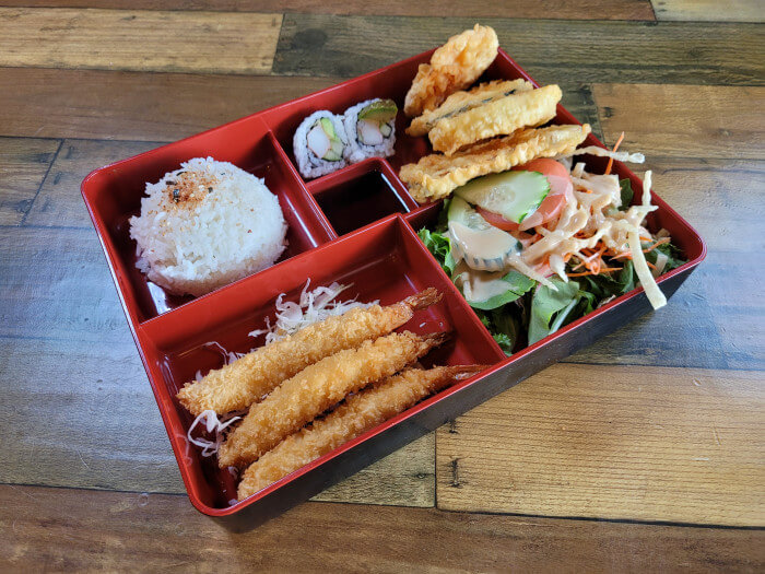 Three pieces of shrimp tempura served with assorted vegetable tempura, two pieces california roll, steamed rice and side salad