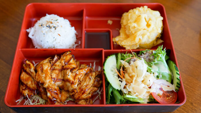 Choice of chicken or pork fried cutlet served with assorted vegetable tempura, two pieces california roll, steamed rice and side salad