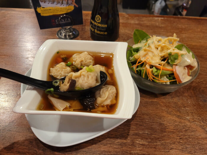 umami dashi broth served with wonton pork dumplings, shiitake mushrooms, peas, carrots, green onions and fried shallots. No substitutions.