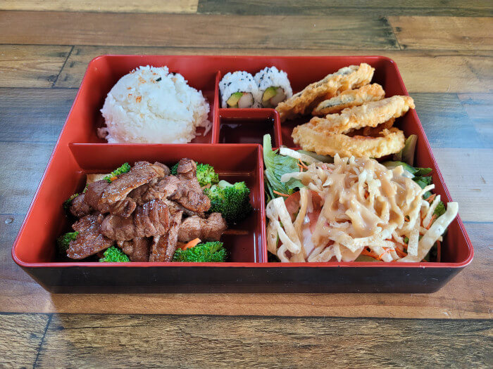 stir-fried beef and broccoli with black pepper soy served with assorted vegetable tempura, two pieces california roll, steamed rice and side salad
