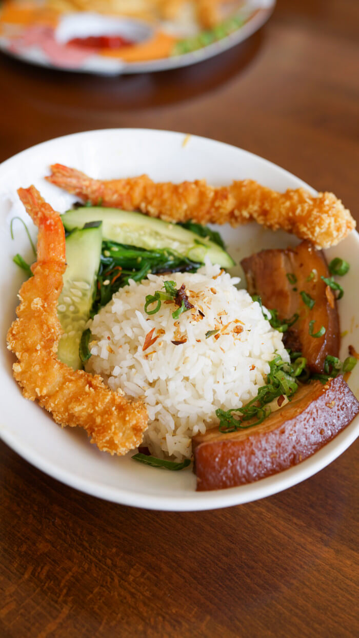 Rice bowl with 2 pieces shrimp tempura, braised pork belly, cucumbers, chuka salad served over rice with furikake and our signature 5-spice umami sauce. No substitutions.